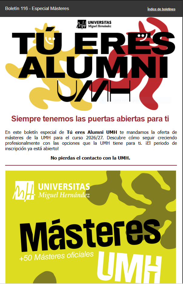 Boletín Tú eres Alumni UMH Especial Másteres 2026/2027